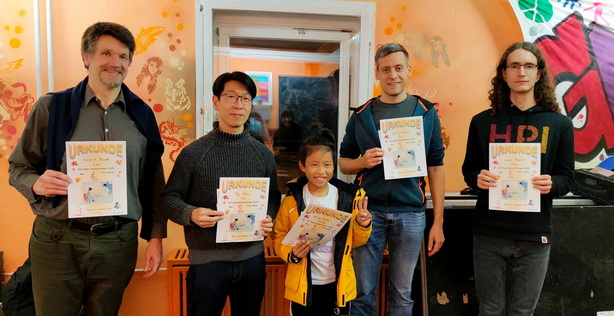 Am 22. und 23. November nahmen 144 Spielerinnen und Spieler am Kranich teil. Es siegte Seongjin Kim, 7D vor Tiany Fu, 6D und Shilong Zhang, 4D. Beste Teilnehmerin wurde Xiyu Zhang, 3D, bester Schüler/Student Adam Dottan, 4D. Valerii Krushelnytskyi begleitete das Turnier mit Partieanalysen, einem Vortrag und Simultanpartien. Wir danken der Humboldt-Universität und der Humboldt-Initiative für freundliche Unterstützung.
